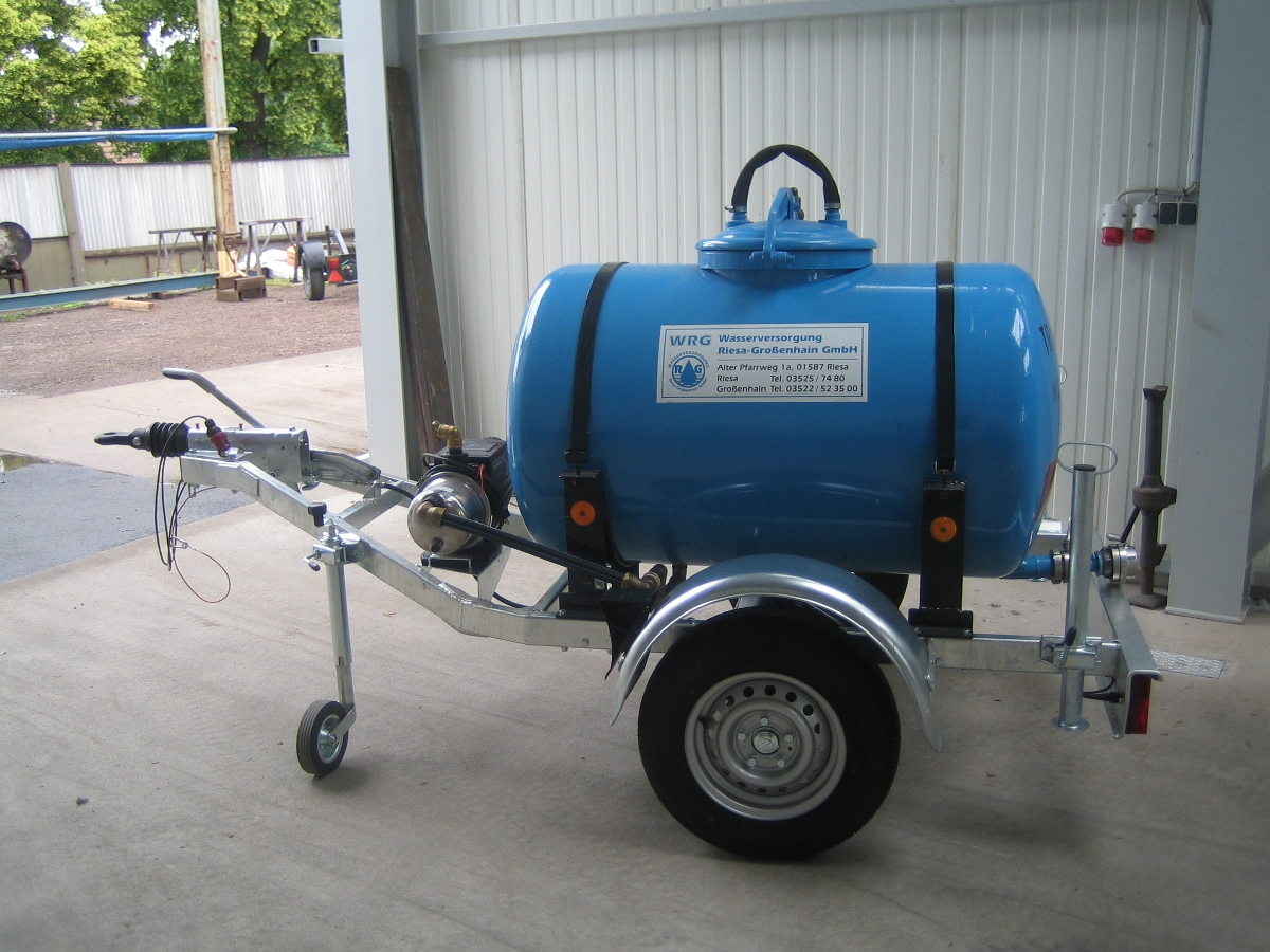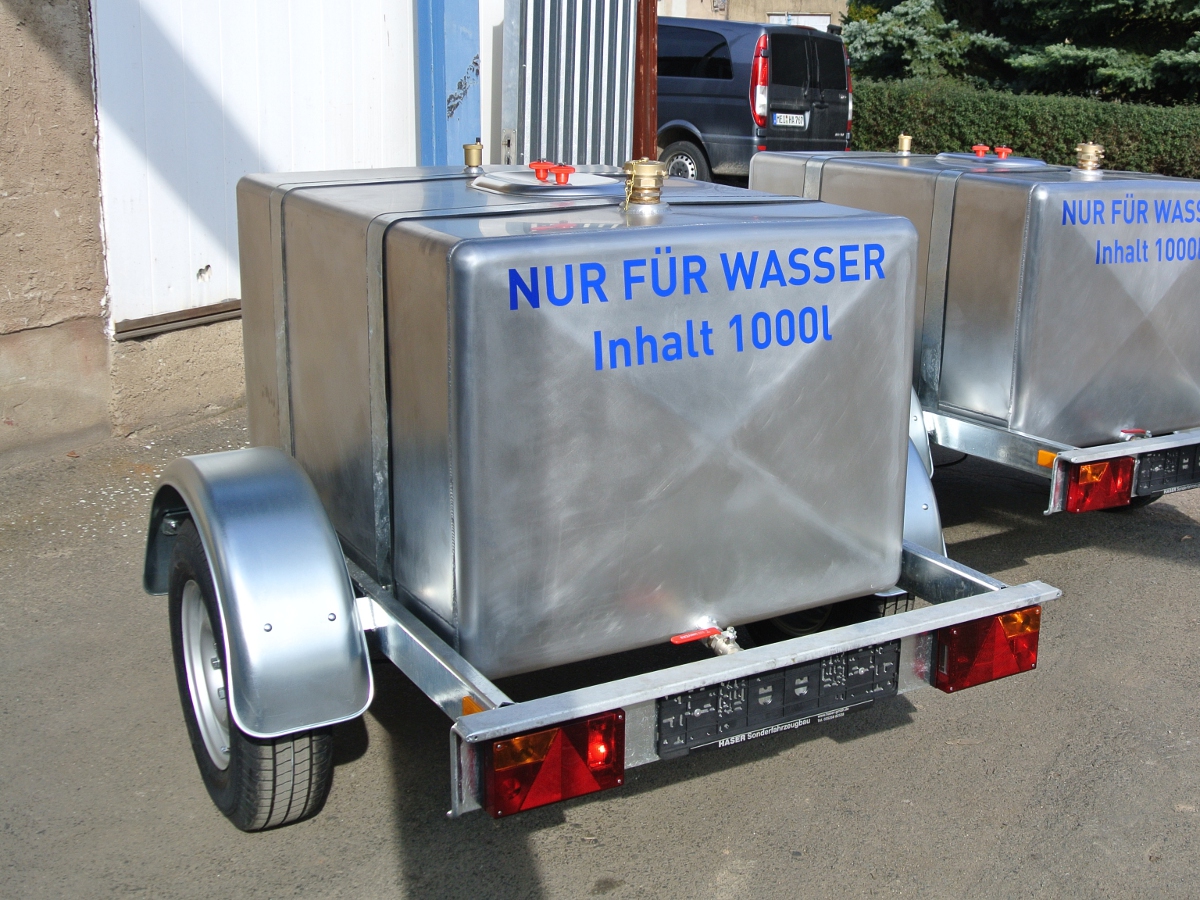 | • als Einachs- oder Tandemanhänger von 1300 bis 2600kg zul. Gesamtgewicht • Wasserbehälter zur Wassernotversorgung mit 750 oder 1000l Inhalt in Aluminium • Behälter für Brauchwasser in PE oder GFK in verschiedenen Größen lieferbar • Anschluss wahlweise (z.B. für C-Schlauch und Pumpe), Revisionsdeckel • wahlweise mit Kugelkopfkupplung oder DIN-Öse auflaufgebremst • Aufbau und Zubehör nach Wunsch |